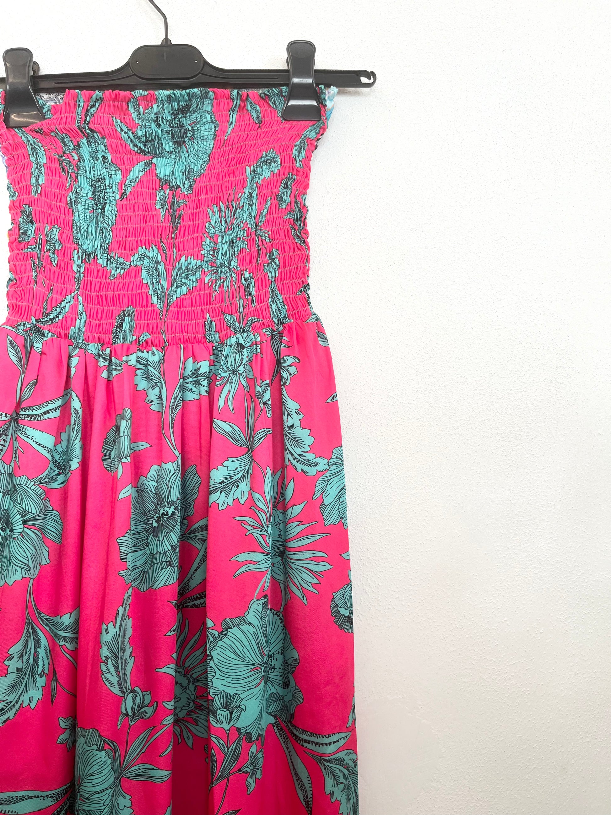 Dettagli: Abito lungo con top a fascia e scollo a cuore leggermente accennato. Bustino interamente elasticizzato a nido d'ape (smock). Fantasia floreale macro e colorata su base fucsia. Tessuto fluido.