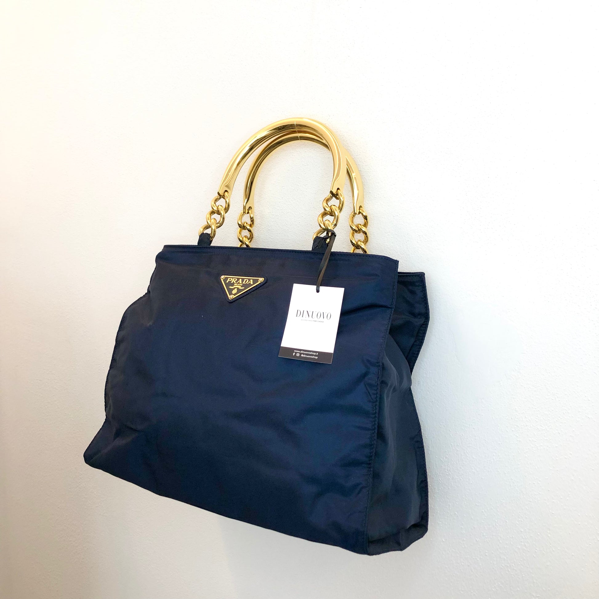 Borsa Prada in Nylon blu con doppio manico in metallo oro